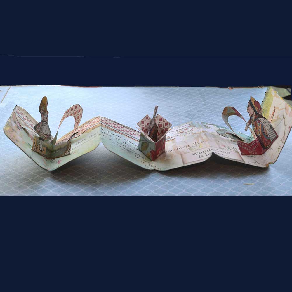 I then made the pop up book. It consists of Alice, the White Rabbit and the Queen of Hearts. Alice and the Queen of Hearts both stand in front of a spiral pop up. In the center is a pop up box with the White Rabbit inside. The book is held in place by a ribbon.